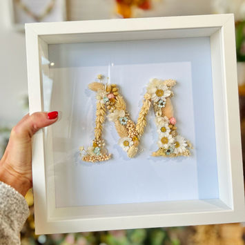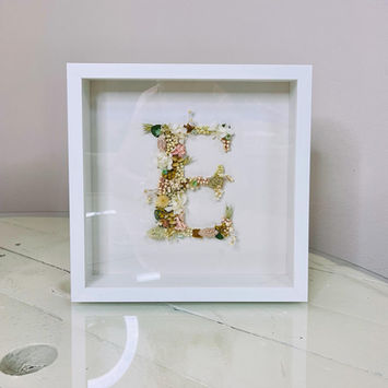 Inicial de flores secas dentro de un marco de madera blanca de 25x25cm.